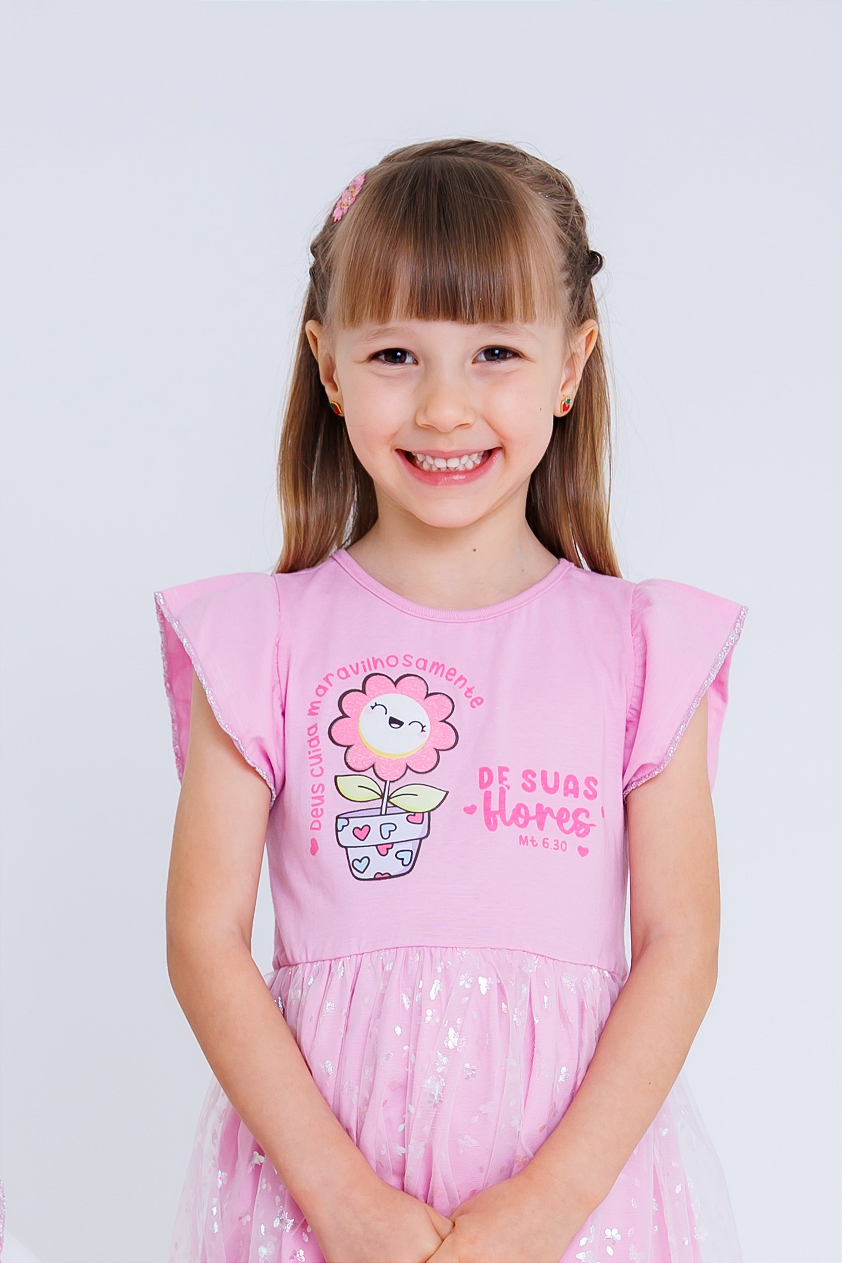 Malha 100% algodão 30x1 penteado, na cor rosa ternura, com aplique de flor e estampa da frase "Deus cuida maravilhosamente de suas flores", saia com sobre-saia em tule cheio de florzinhas e borboletinhas furta-cor, manga toda com babadinho e costura com linha na cor prata, todos os detalhes para deixar sua pequenina uma verdadeira graça!