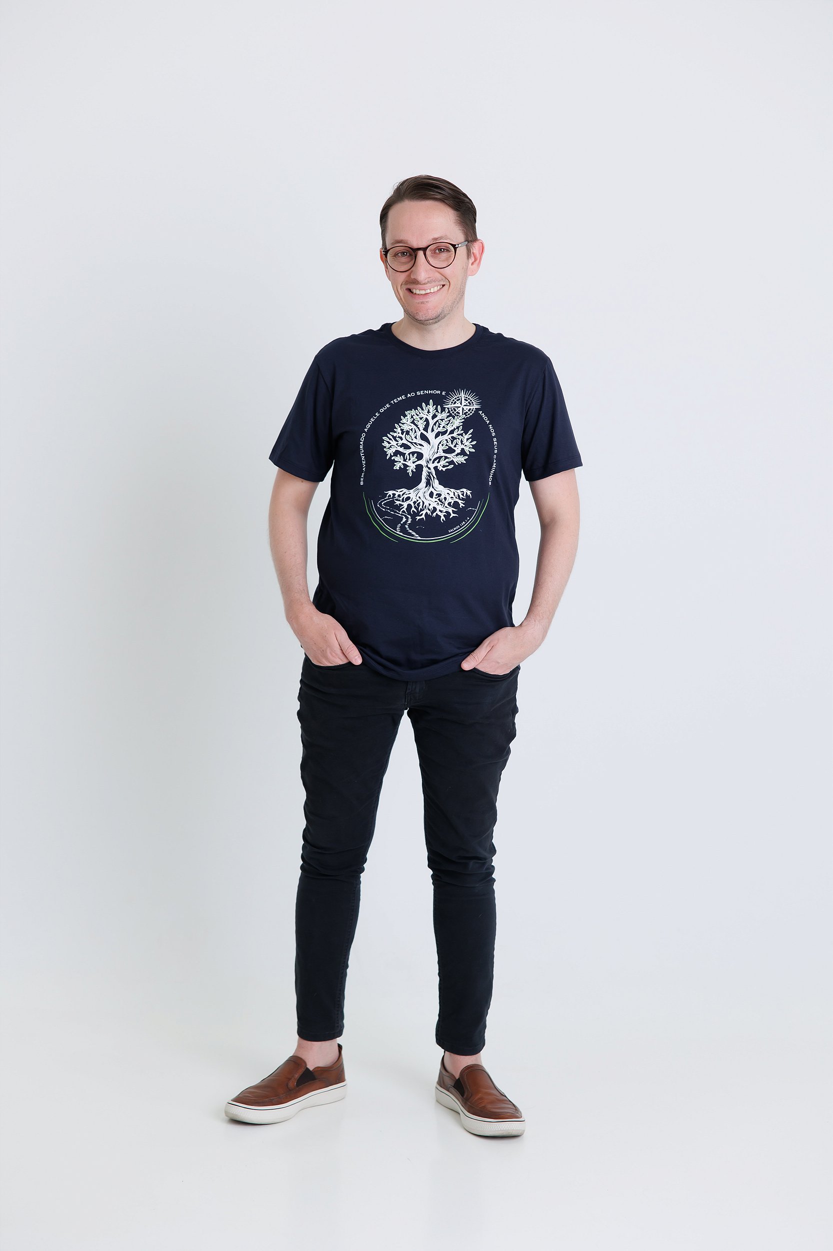 Camiseta inspirada no Salmo 128.1-4: "Bem-aventurado aquele que teme ao SENHOR e anda nos seus caminhos. Pois comerás do trabalho das tuas mãos; feliz serás, e te irá bem. A tua mulher será como a videira frutífera aos lados da tua casa; os teus filhos como plantas de oliveira à roda da tua mesa. Eis que assim será abençoado o homem que teme ao Senhor.”