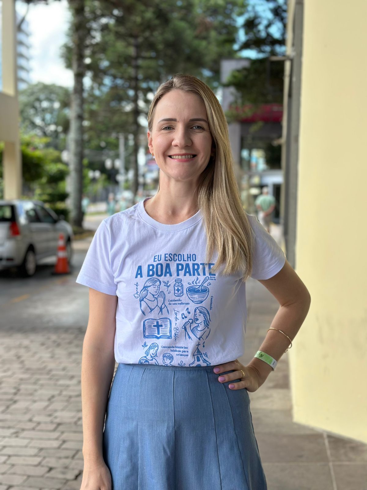 Camiseta feminina inspirada na história biblica de Maria e Marta (conforme Lucas 10.38-42).