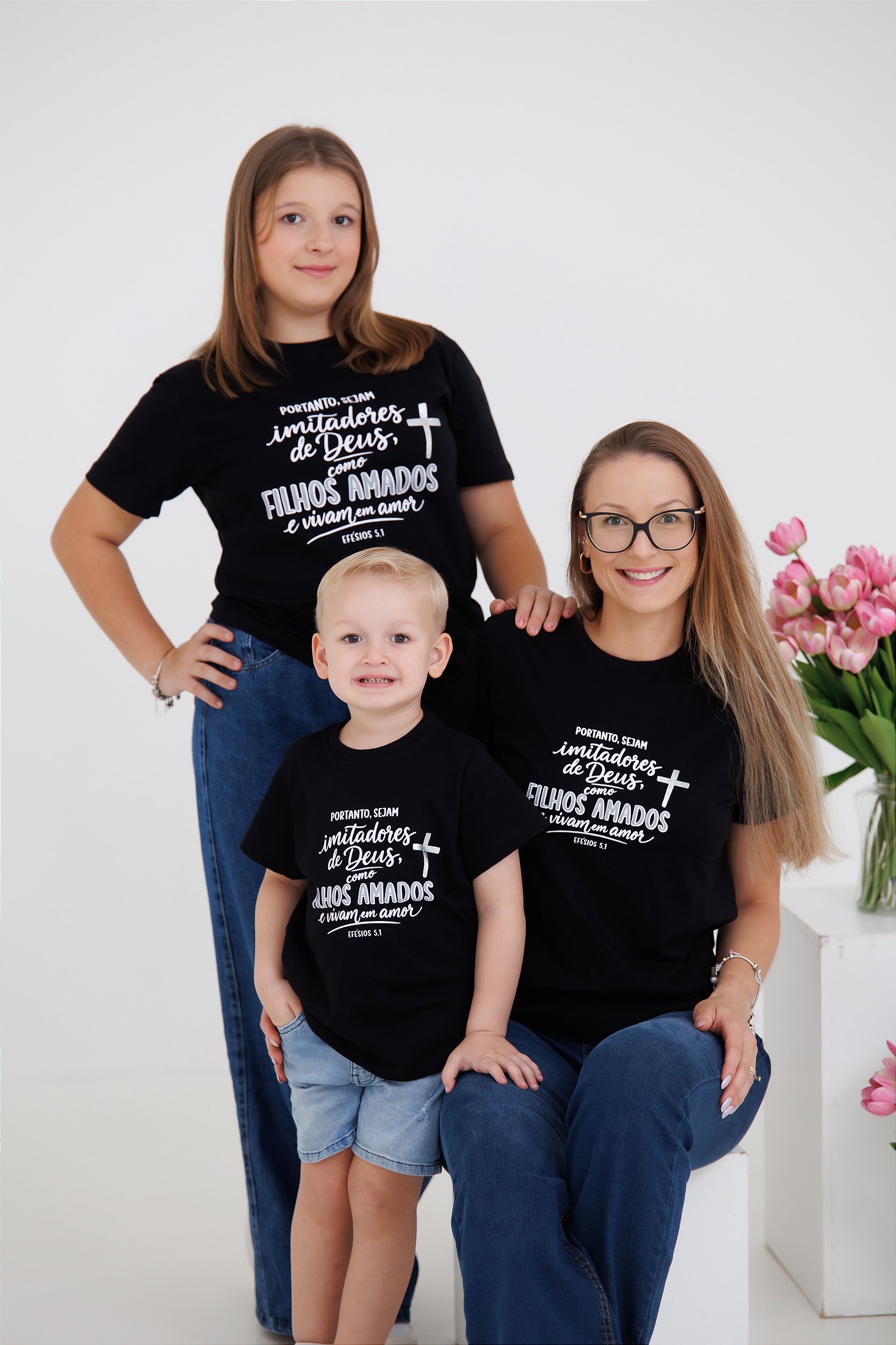 Com uma maravilhosa estampa no texto bíblico de Efésios 5.1-2: "SEJAM IMITADORES DE DEUS, COMO FILHOS AMADOS, E VIVAM EM AMOR", a camiseta é confeccionada com malha 100% algodão penteado de excelente qualidade, tem a ribana na cor da peça e uma estampa em serigrafia com cores alegres e um lindo detalhe em foil que traz mais sofisticação à peça.
