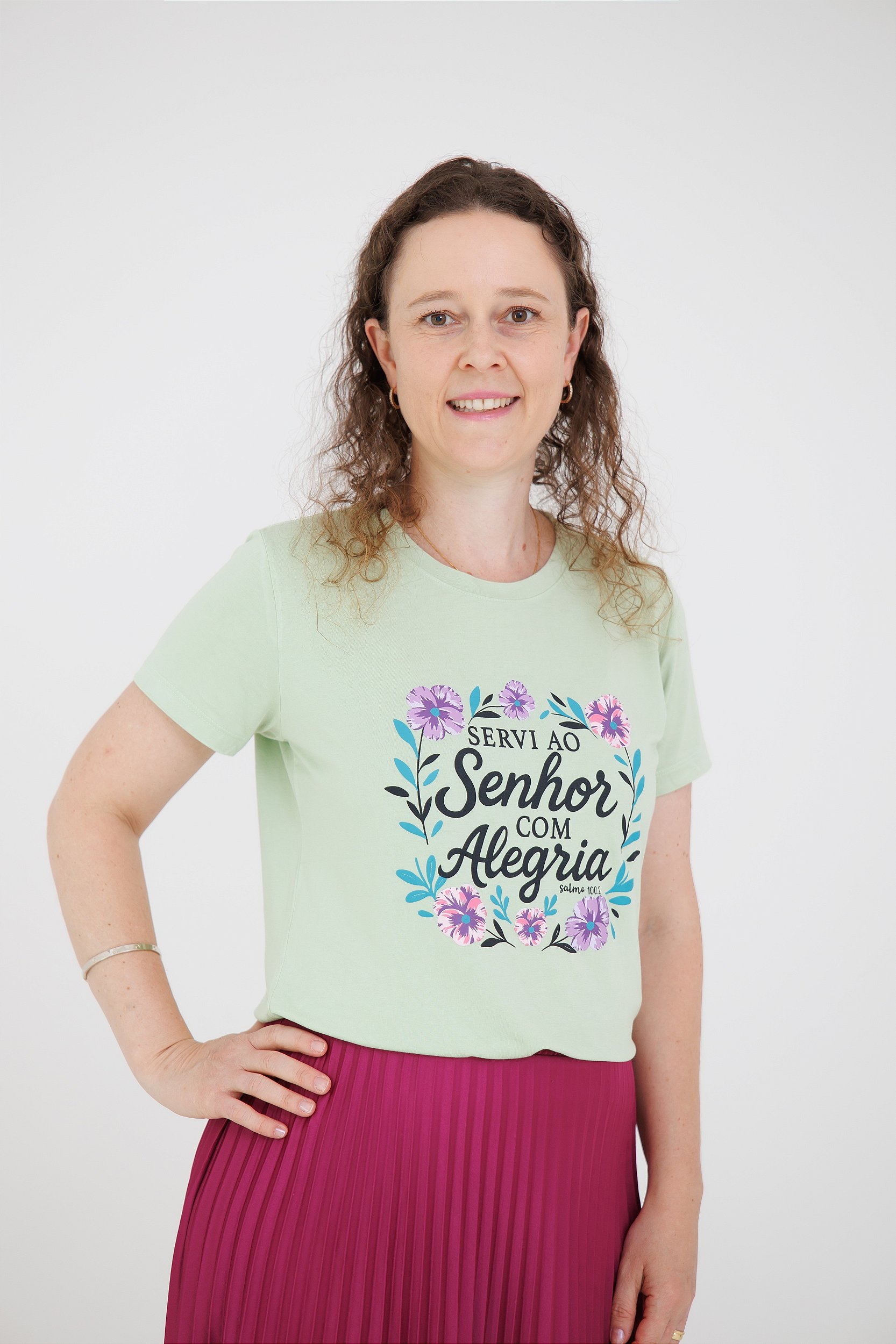 Camiseta adulta inspirada no texto de Salmo 100.2: "SERVI AO SENHOR COM ALEGRIA!"