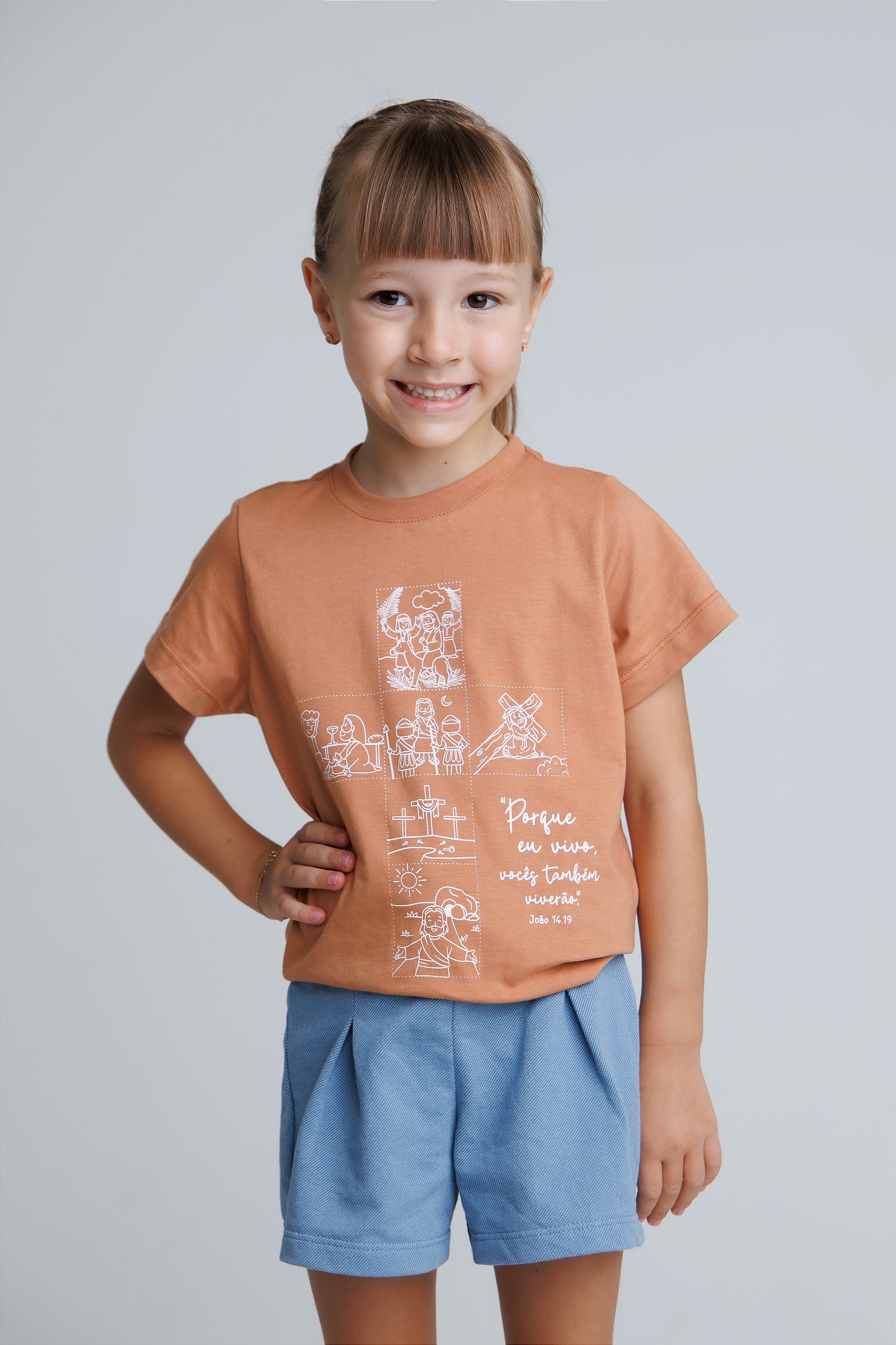 Estampa localizada frontal e um lindo versículo biblico da Páscoa na cor branca, reforço ombro-a-ombro na gola combinando com a estampa.