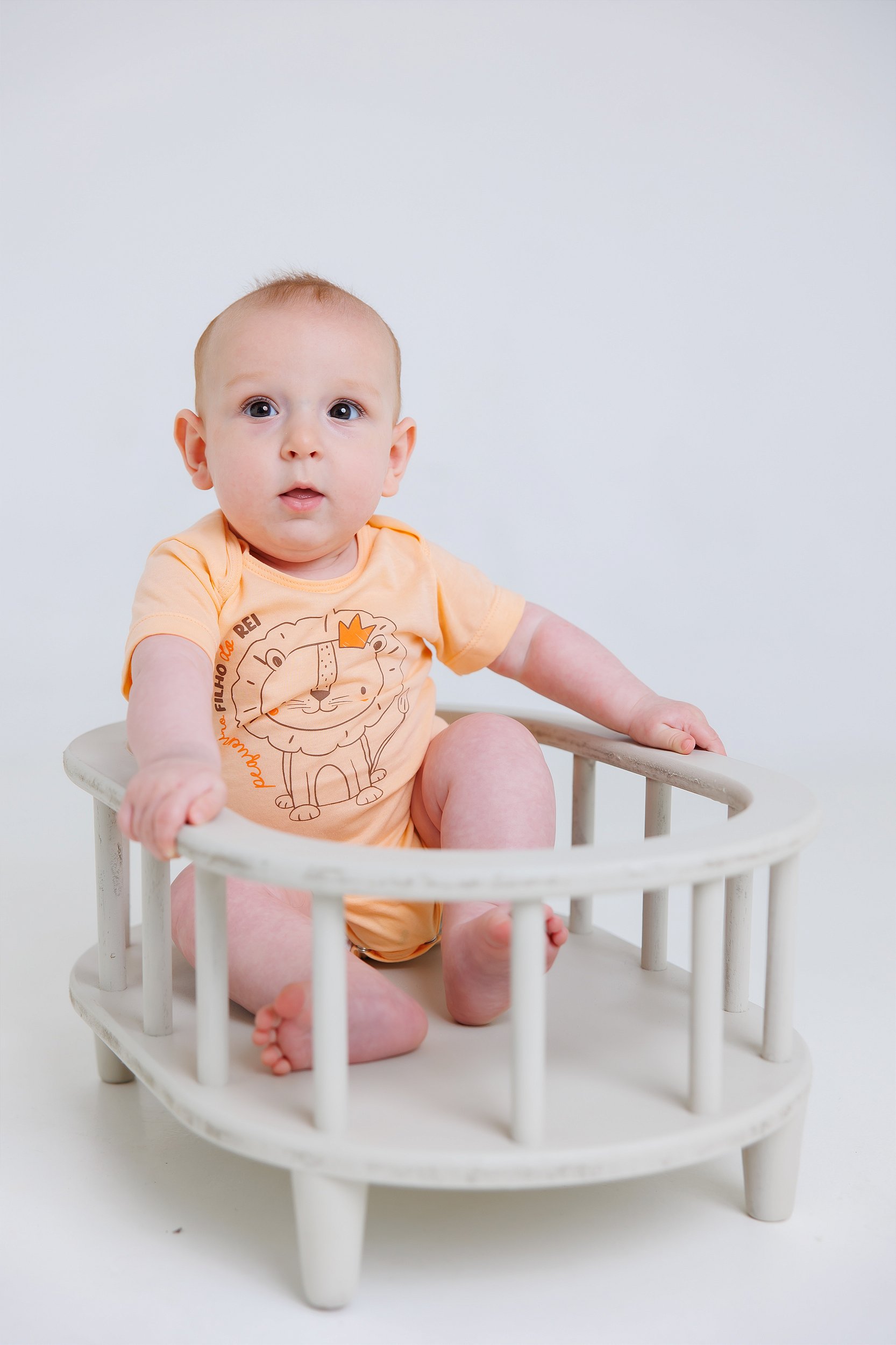 Body confecionado em malha 100% algodão, malha 30x1 na cor laranja e estampa em serigrafia linda de um leãozinho e a frase "Pequenino Filho do Rei", para deixar os pequeninos ainda mais lindos!